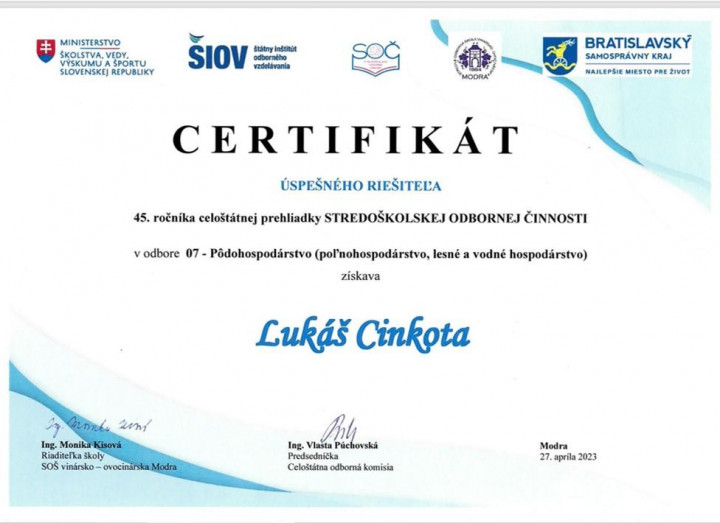 Lukáš Cinkota so svojou prácou na tému Africký mor ošípaných a jeho priebeh v okrese Veľký Krtíš si vybojoval v kategórii 07 Poľnohospodárstvo, lesné, vodné hospodárstvo krásne 6. miesto.